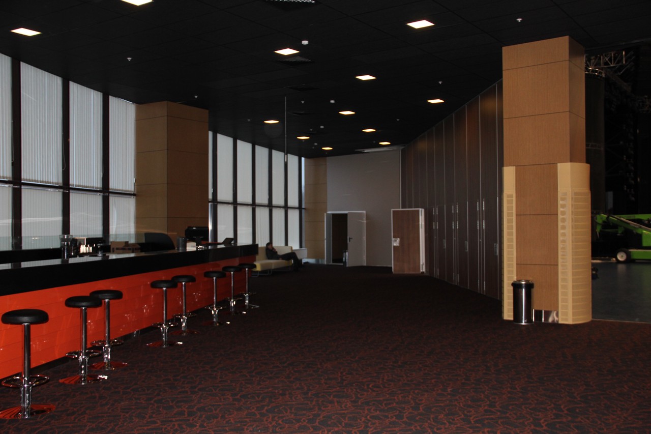 - Вход в зал - справа. При этом попадаешь между сценой и зрительскими трибунами, на уровень нижнего ряда.