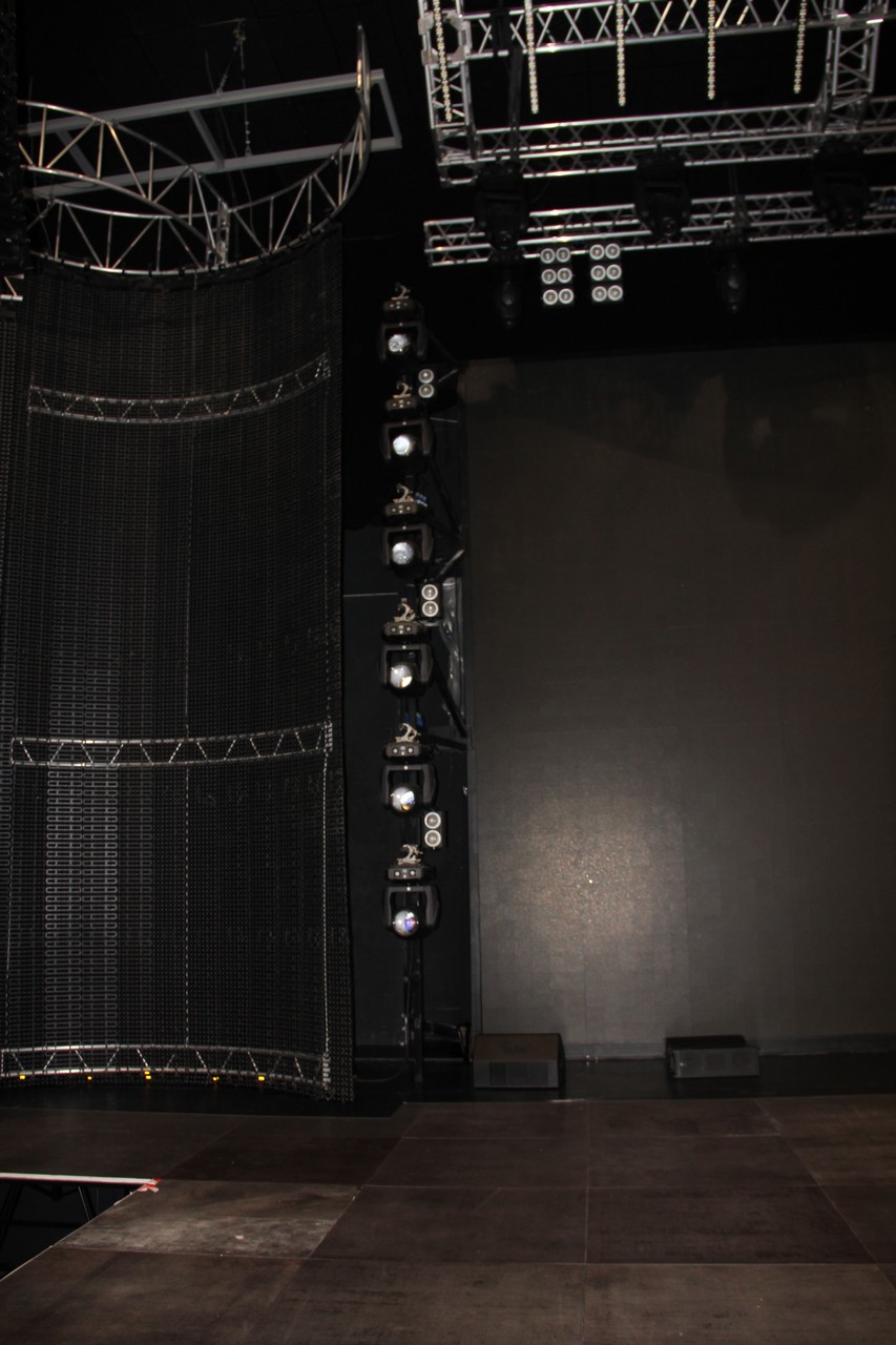 - Эта "волна" - на самом деле экран. Проходов за сцену два: перед этой волной (чуть шире) и между волной и центральным экраном. Также видны осветительные приборы рядом с кулисой.